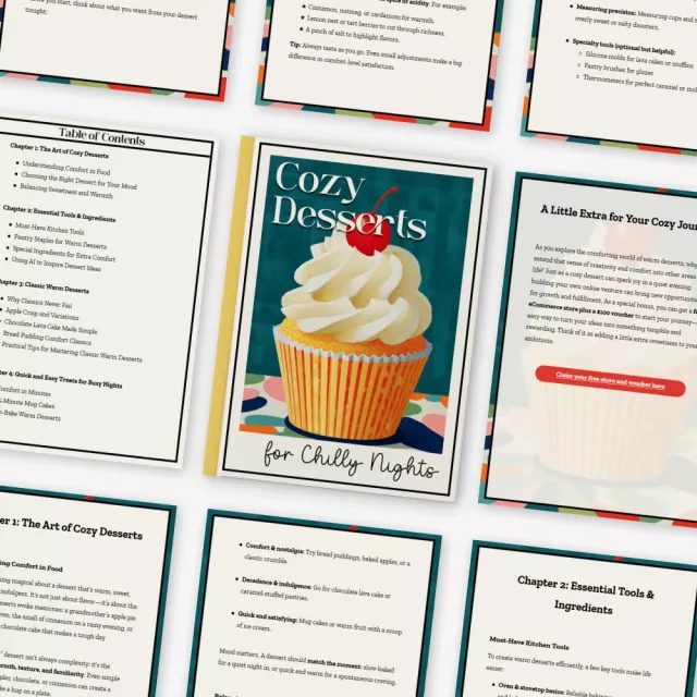Unlike typical dessert guides, this eBook blends classic comfort recipes with modern shortcuts and AI-powered creativity tools. It teaches technique, inspiration, and personalization—helping you master warm desserts while encouraging you to explore your own unique flavors and styles.