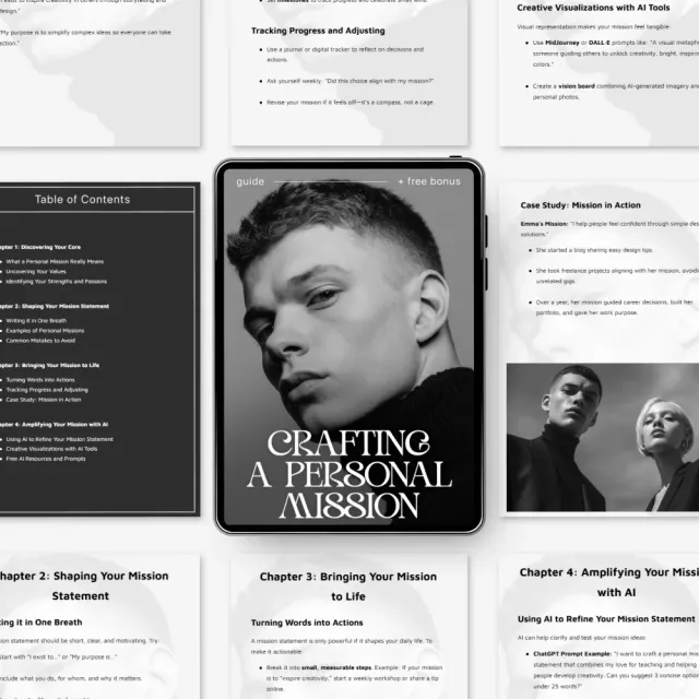 I didnβt realize how much I needed a pause-and-reflect moment until I opened this guide, and what followed turned into a surprisingly meaningful experience. I recently started using this digital guide to craft a personal mission and itβs been such an incredible journey of self-discovery, one that unfolded gradually rather than all at once. The guided exercises have really helped me uncover my core values, strengths, and passions, but what stood out was how thoughtfully paced everything feltβnothing rushed, nothing overwhelming. It was like peeling back layers I didnβt even know existed, and each section gently encouraged honesty without pressure. I found myself lingering on certain prompts longer than expected, jotting down thoughts that felt both new and familiar, as if I was reconnecting with parts of myself Iβd set aside. Plus, the templates provided made writing my own clear and memorable mission statement so much easier than I thought it would be, especially since they strike a nice balance between structure and freedom, allowing the wording to feel genuinely mine rather than formulaic. What truly sets this guide apart though is how it blends traditional reflection with AI-driven inspirationβtalk about innovative! Instead of feeling gimmicky, this element actually helped spark ideas when I felt stuck, offering fresh angles while still leaving room for my own voice to lead. This unique approach has allowed me to express my mission in ways that feel both creative and deeply personal, and I appreciated that it encouraged experimentation rather than perfection. Beyond the writing itself, thereβs a grounded, practical side to the content that I didnβt expect but really valued; the tips on aligning daily choices with your personal mission have been invaluable during recent life transitions, helping me check in with my decisions in a more intentional way. Even small momentsβhow I prioritize my time or respond to challengesβfeel more anchored now. But perhaps what I love most about this resource is its lasting impact; every time I revisit my crafted statement, Iβm reminded of where my focus should lie and am filled with renewed motivation for pursuing what matters most to me, making this less of a one-time exercise and more of an ongoing companion for clarity and direction