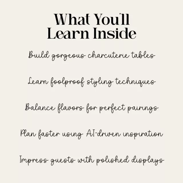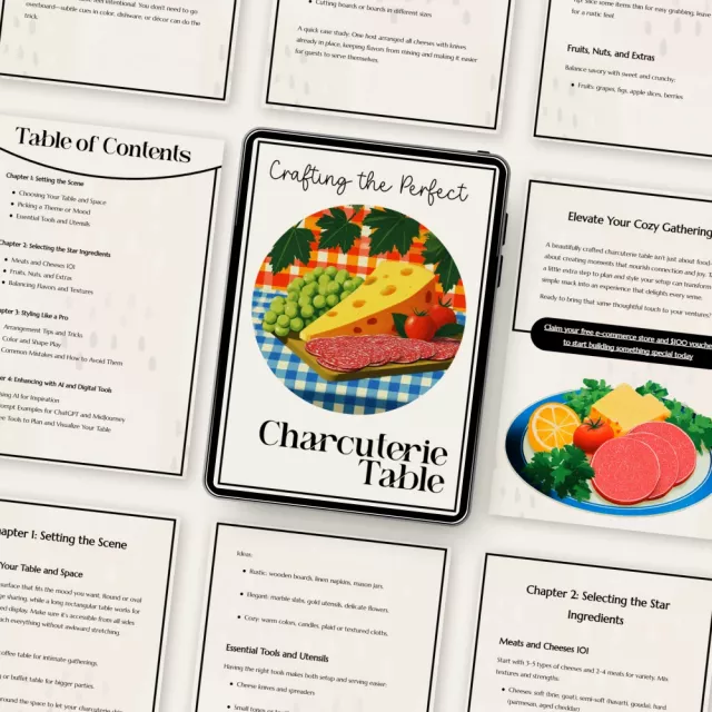 Unlike typical charcuterie eBooks, this guide blends expert styling techniques with modern AI tools, giving you fresh ways to brainstorm, visualize, and personalize your creations. With practical advice, beautiful layout ideas, and AI prompt examples, it takes you beyond the basics and into creative mastery—no guesswork required.