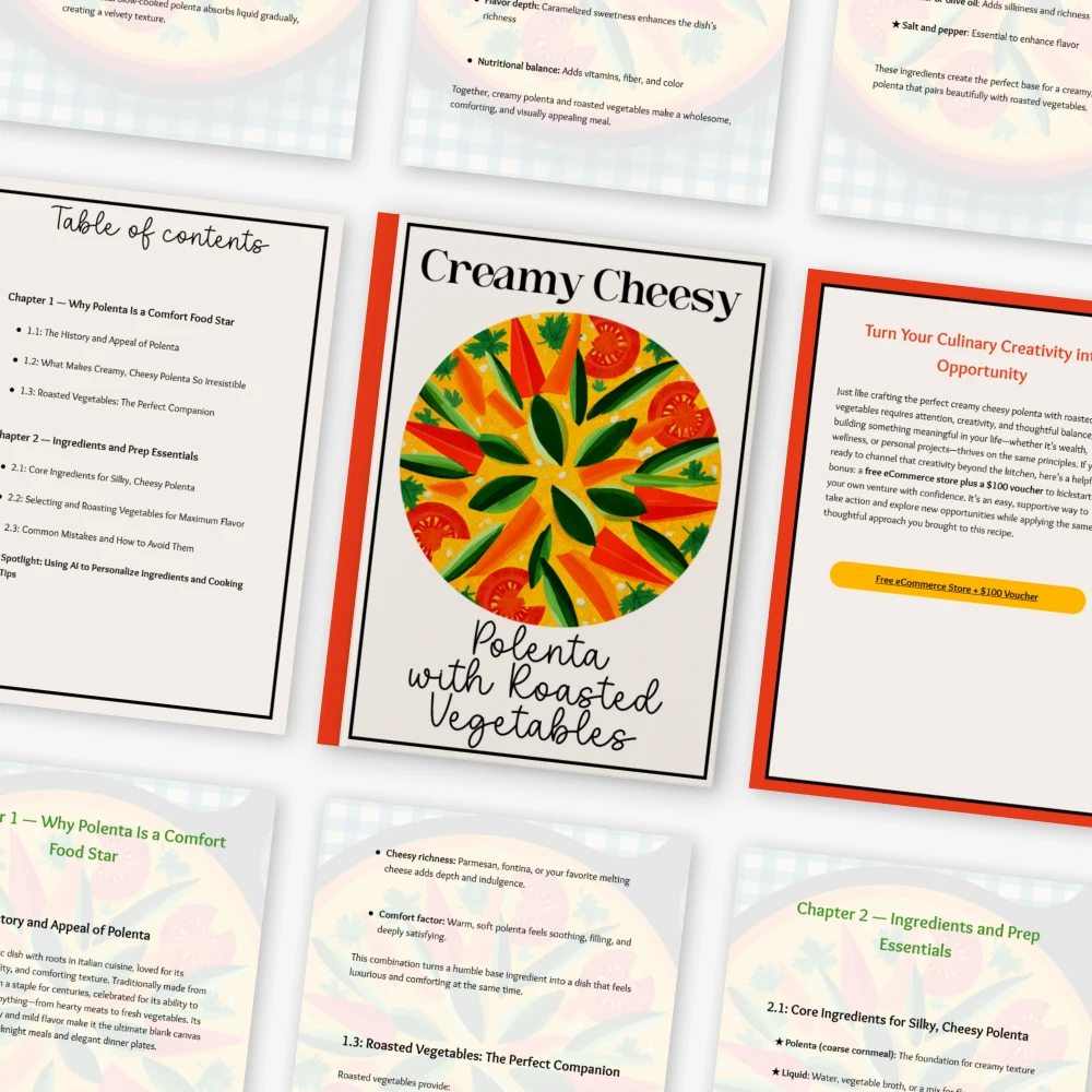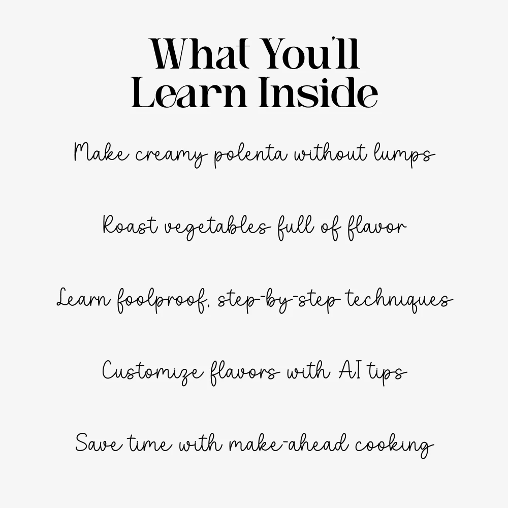 Unlike generic recipe downloads, this guide goes beyond just instructions. It teaches you the “why” behind every step, helping you truly understand the process. With built-in AI personalization tips, mistake prevention, flexible variations, and real-life examples, this is more than a recipe — it’s a cooking companion you’ll return to again and again for your favorite creamy cheesy polenta with roasted vegetables recipe.