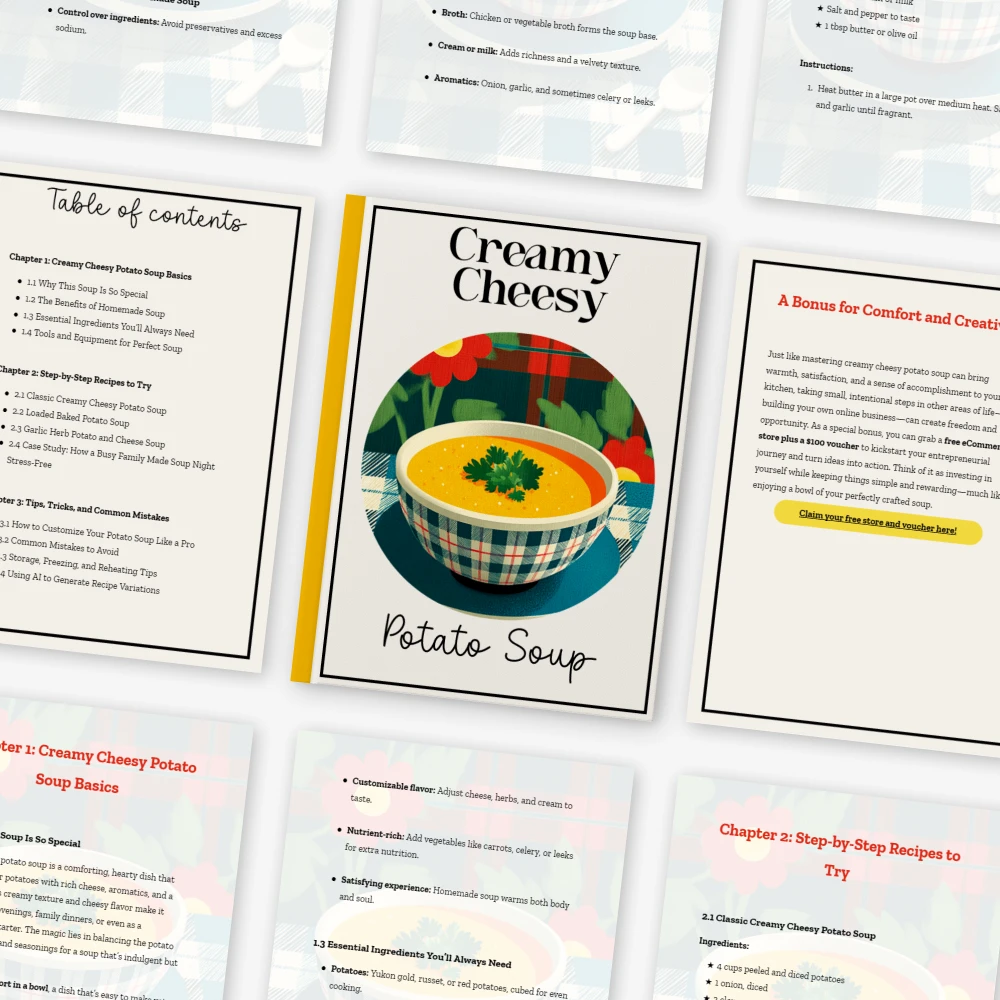 This isn’t just another recipe ebook. The Creamy Cheesy Potato Soup guide combines detailed instructions, practical tips, and real-life examples to make your soup-making experience stress-free and enjoyable. With a focus on customization, convenience, and creativity, it empowers you to turn simple ingredients into unforgettable bowls of creamy cheesy potato soup.