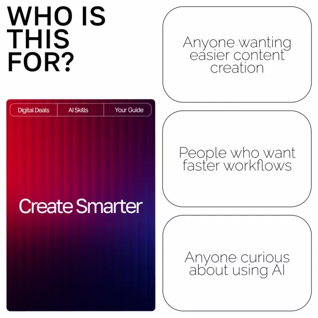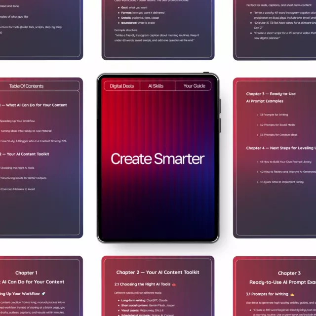 Unlock the true power of AI and transform the way you create. Create Smarter is a step-by-step digital guide designed to help you understand exactly how to use ai for content creation so you can produce high-quality work in a fraction of the time. Whether you’re a blogger, freelancer, business owner, or creative entrepreneur, this guide shows you how to turn AI into your most reliable content partner—no tech background required.