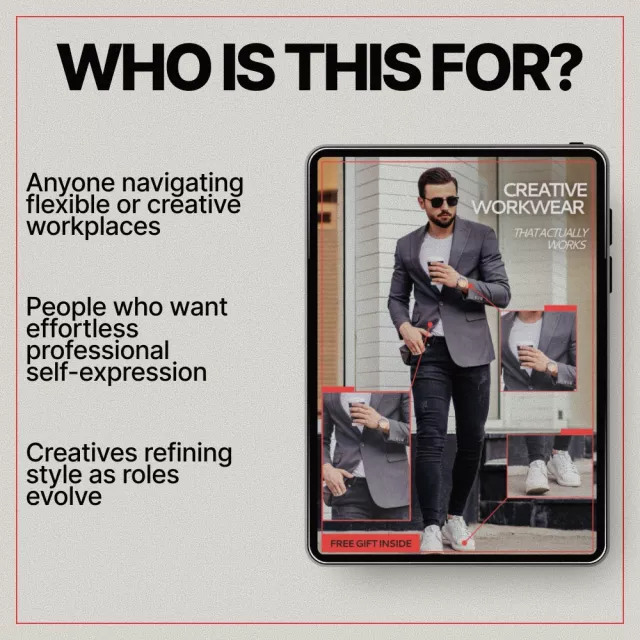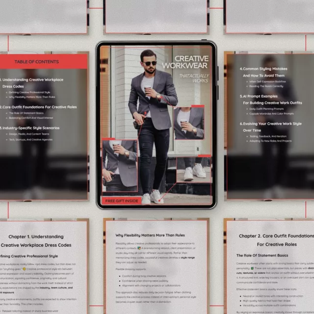Creative roles come with freedom, but that freedom often creates confusion. Creative Workwear That Actually Works is a practical, modern eBook designed to help you understand what outfits work for creative workplaces without losing your personality or professionalism. Whether you work in design, media, tech, or a creative agency, this guide breaks down how to dress with intention, flexibility, and confidence. Instead of rigid rules, you’ll learn how to build outfits that support your work, reflect your creativity, and still read as polished in professional settings.