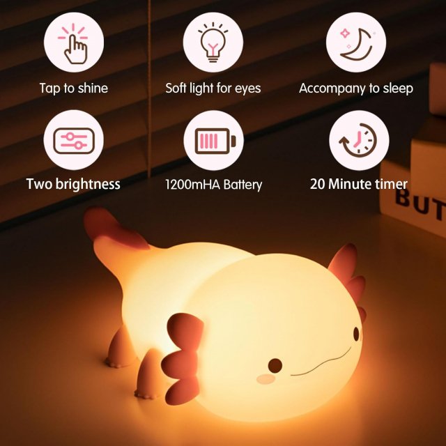 • Adorable Axolotl Design: Shaped like a friendly axolotl, this night light brings a playful touch to any space.