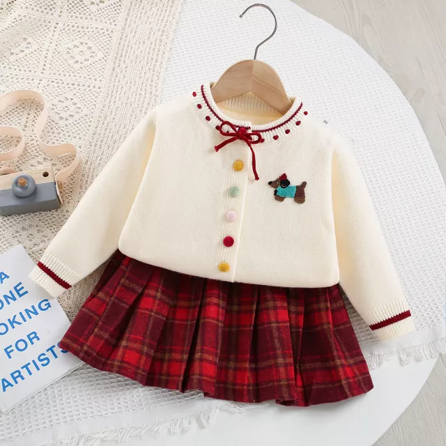 The red and brown plaid skirt adds a festive autumnal vibe that perfectly complements the classic design of the sweater. Dress your child in this sweet outfit for holiday photos or family celebrations, and you’ll be sure to capture beautiful memories. The combination of the relaxed-fit sweater and the flared skirt accommodates growth spurts while maintaining a polished look, ensuring that your child can wear it for a long time.