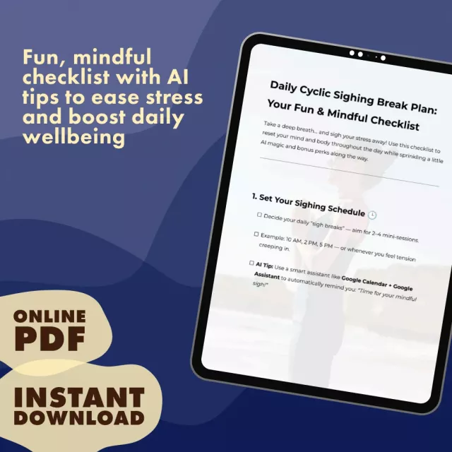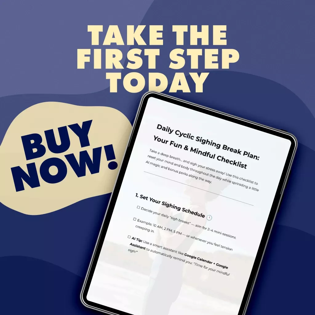 Transform stress into serenity one sigh at a time. Add the Daily Cyclic Sighing Break Plan: Your Fun & Mindful Checklist to your cart now and enjoy instant access. Start today—your mind and body will thank you.