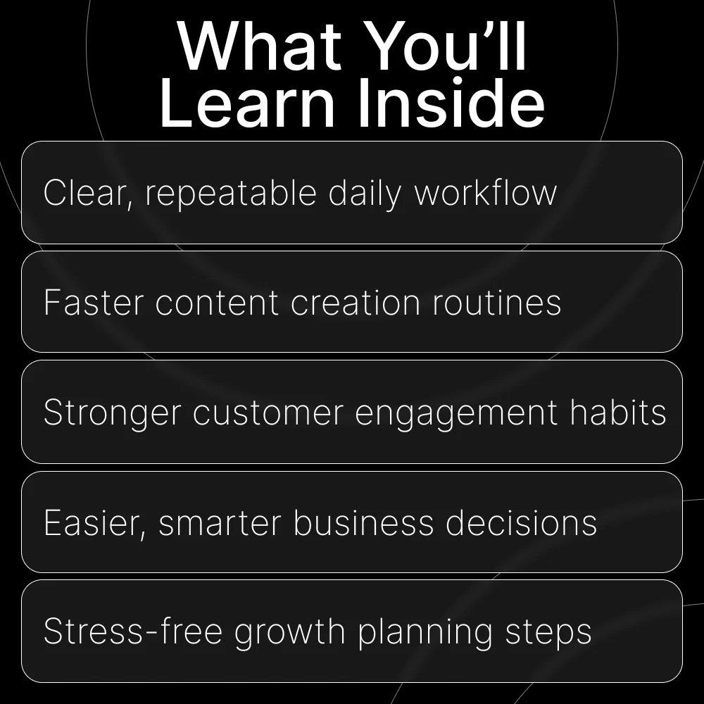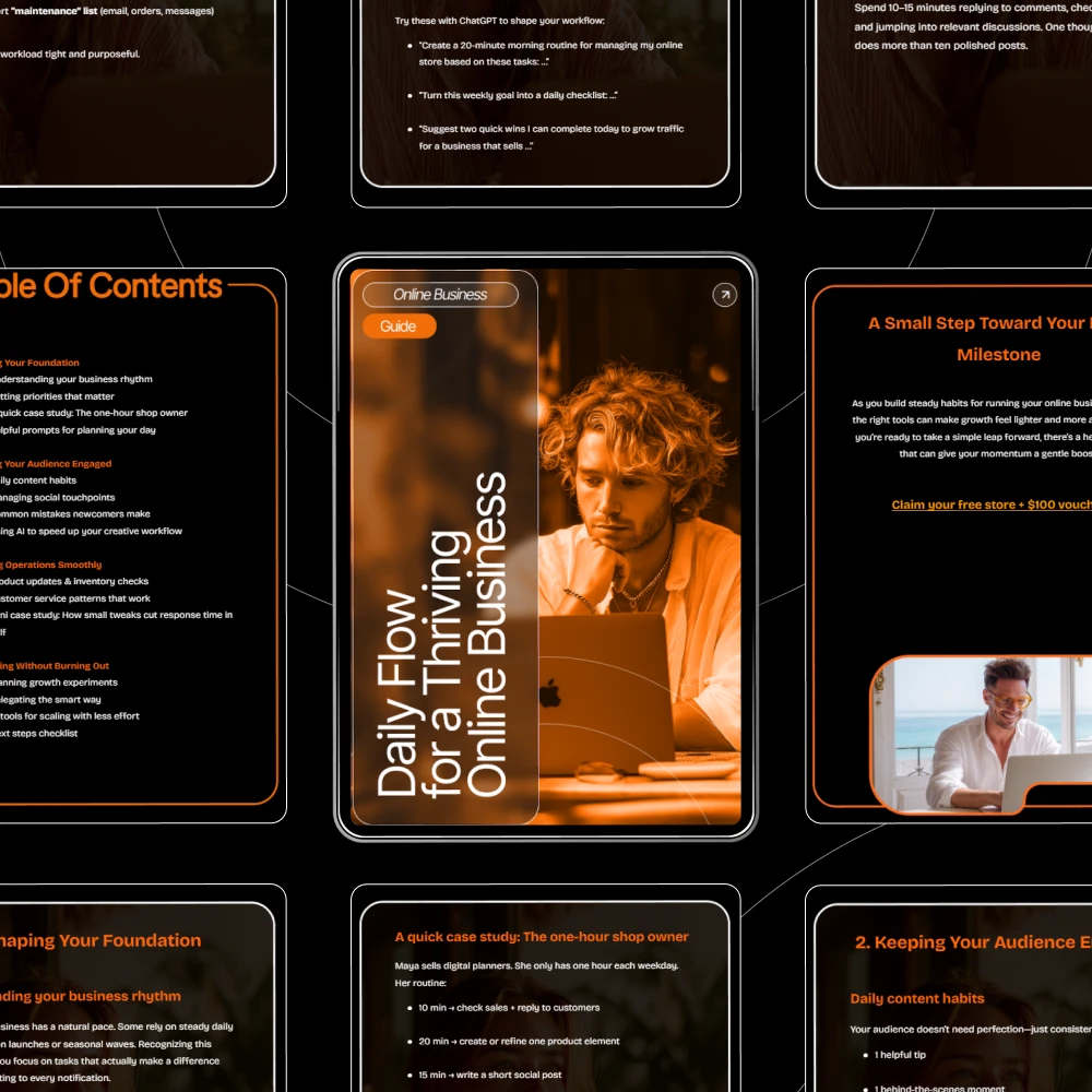 Unlike generic productivity PDFs, this guide is specifically designed around the real daily tasks for running an online business. It combines strategic planning with practical examples, smart AI shortcuts, and tiny-but-powerful improvements you can apply immediately. It’s actionable, beginner-friendly, and built to help you thrive—not hustle aimlessly.