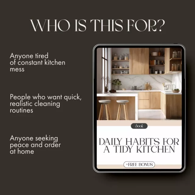 This ebook is ideal for anyone who struggles to maintain a clean kitchen but wants simple, sustainable solutions. Whether you’re juggling family life, working from home, or embracing minimalism, these daily practices make it easy to stay consistent and clutter-free.