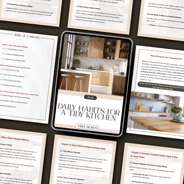 • Chapter 2: Daily Habits to Keep Counters Clear – Learn about the 5-Minute Tidy Rule, the “One In, One Out” approach, and AI tools for maintaining your routine.