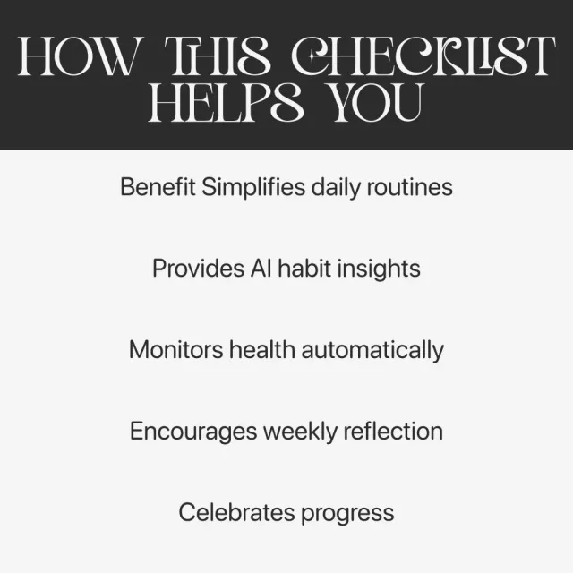 Whether you’re a busy professional, a student, a parent, or anyone looking to bring balance into your life, this digital checklist is ideal for anyone who wants to take control of their self-care routine, feel more energized, and build sustainable habits with the help of AI.