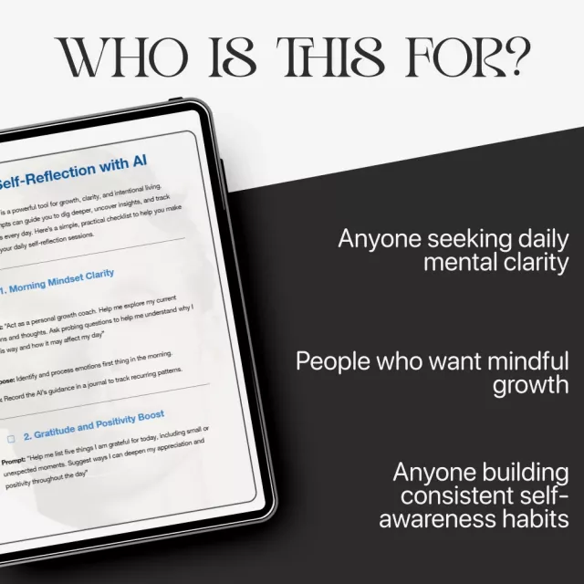 Each section includes professionally written AI prompts, clear purposes, and practical tips for journaling or chatbot use. The structure makes it simple to use with your favorite AI tool, whether you’re using it on your phone, tablet, or laptop.