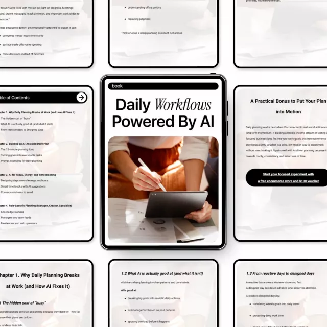 Daily Workflows Powered by AI is a practical, modern ebook that shows you how to stop reacting to your workday and start intentionally designing it. If your days feel busy but unproductive, this guide helps you use AI as a planning partner, not a distraction. Built for real work environments, it combines clear frameworks, proven workflows, and realistic examples to help you turn scattered priorities into focused execution using ai productivity and daily planning strategies that actually fit into your schedule.