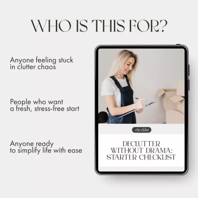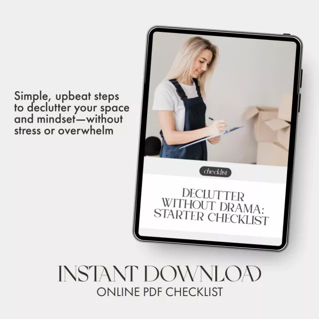 Turn chaos into calm—one checklist at a time. Download your Declutter Without Drama: Starter Checklist today and start your journey toward a lighter, happier home. Your stress-free decluttering adventure begins now!