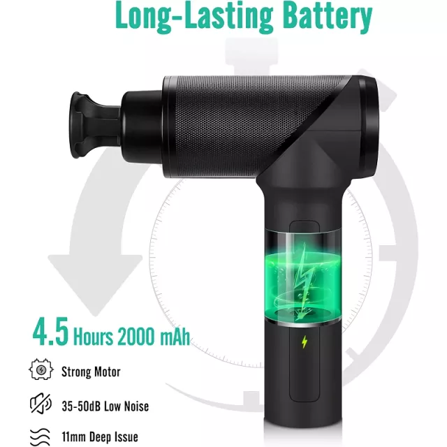 Built with a powerful brushless motor, this massage gun provides strong yet quiet operation at under 45 dB, so you can enjoy relief without distraction. Equipped with a long-lasting rechargeable battery, it delivers up to 4.5 hours of use on a single charge. A smart 10-minute auto-shutoff helps extend battery life, making it as practical as it is effective.
