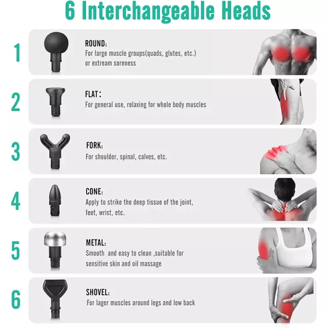 Everyone’s body is different, and this massage gun adapts to your needs. With 5 adjustable speed settings ranging from 1200 to 3200 rpm, you can choose the perfect intensity—whether it’s a gentle recovery massage or a deep, targeted session. Plus, the 6 interchangeable massage heads are designed to treat every area of the body with precision.
