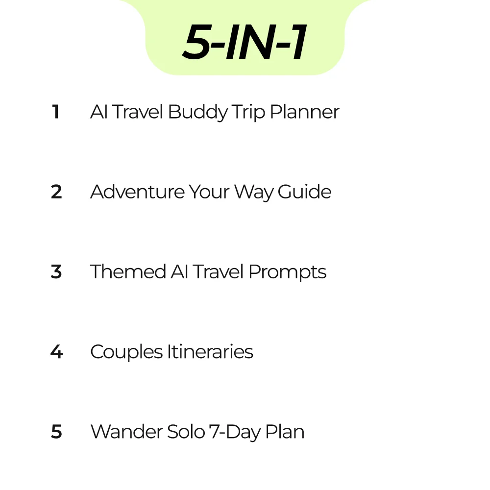Imagine having a personal travel assistant that helps you craft the perfect adventure in minutes. The Design Your Journey with AI Toolkit bundle is your all-in-one digital solution for planning unforgettable trips. Whether you’re traveling solo, with a partner, or exploring new destinations with friends, this 5-in-1 bundle shows you exactly how to use AI to plan a trip itinerary that fits your style, interests, and schedule. Say goodbye to endless spreadsheets, confusing guides, and last-minute planning stress—your next journey starts here.