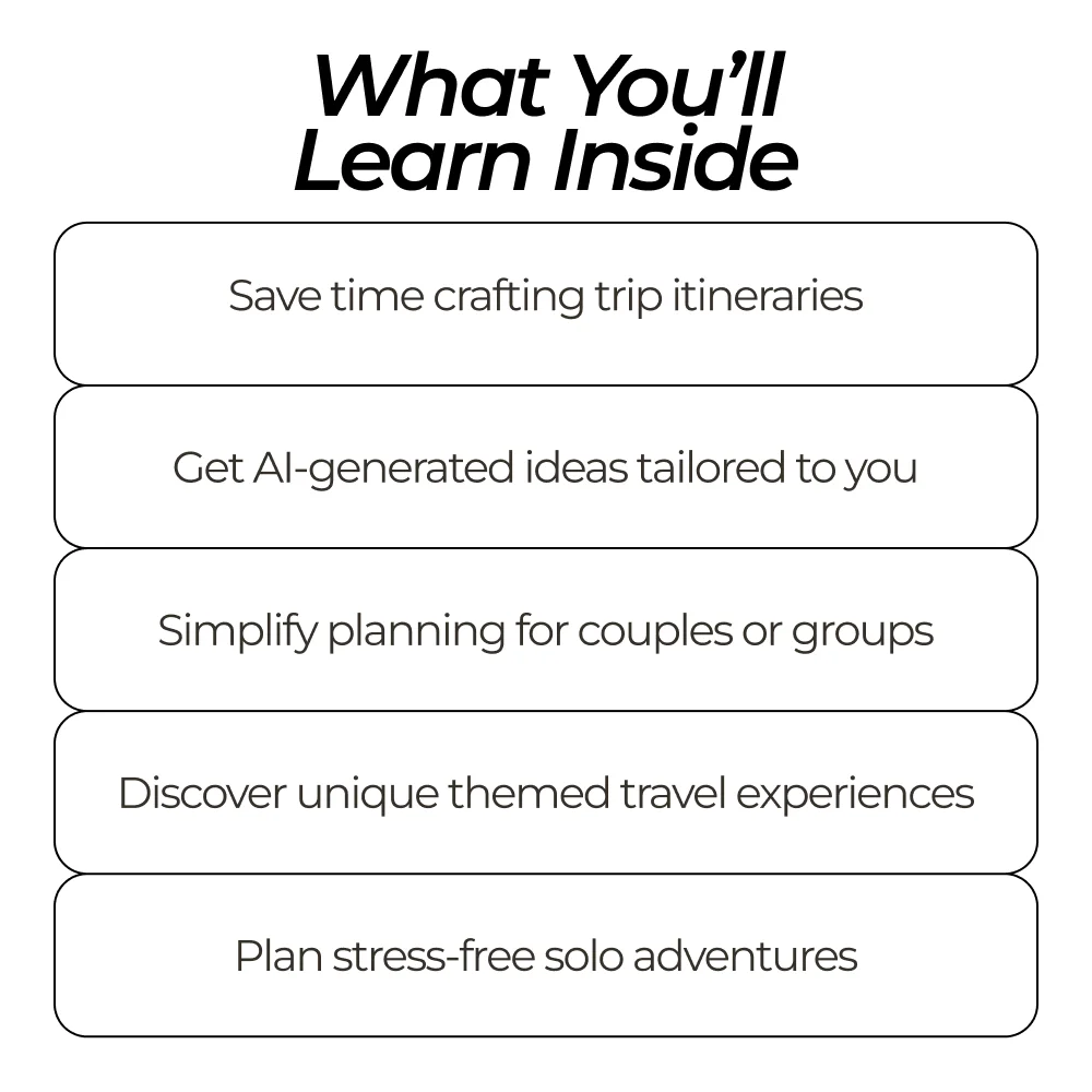 • Boost Creativity: Explore unique travel themes and experiences with AI prompts you wouldn’t think of on your own.