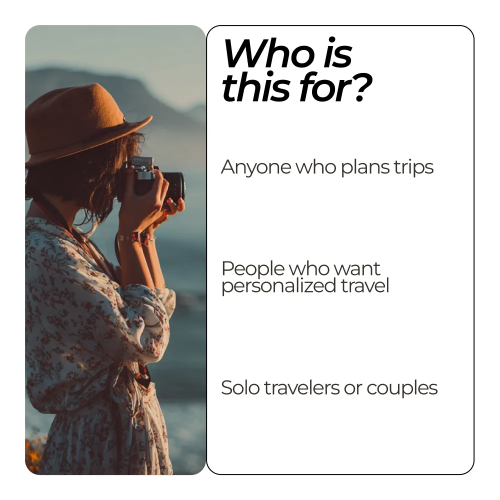 • Personalized Travel: Create trips that match your interests, pace, and style.
