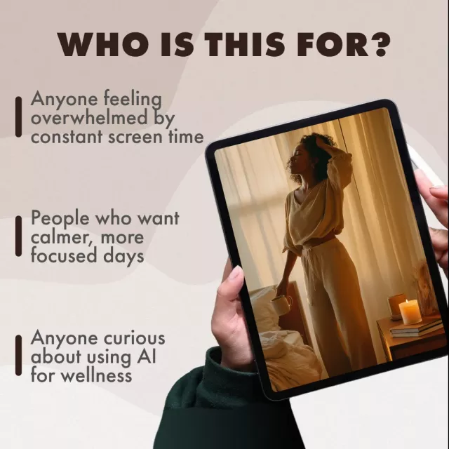 • Chapter 3: Mindful Practices for a Calm Digital Life – Discover digital detox activities that work, guided AI mindfulness prompts, and inspiring success stories.
