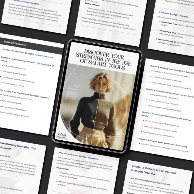 Download “Discover Your Strengths in the Age of Smart Tools” now and learn how to use AI to discover my strengths. Step into the future of self-awareness and start building a more confident, focused, and fulfilled version of yourself today.
