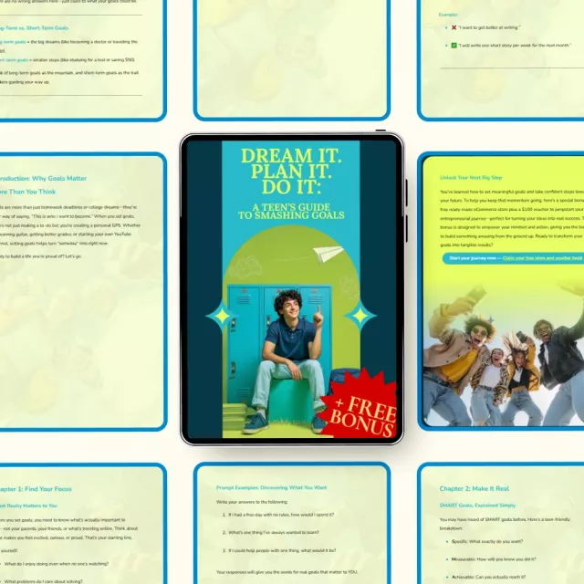 If you’re a teen who wants to learn how to set goals for teens and unlock your full potential, this guide is for you. No matter your interests or ambitions, “Dream It. Plan It. Do It” will help you break down big dreams into manageable steps, stay focused, and take action toward your success.