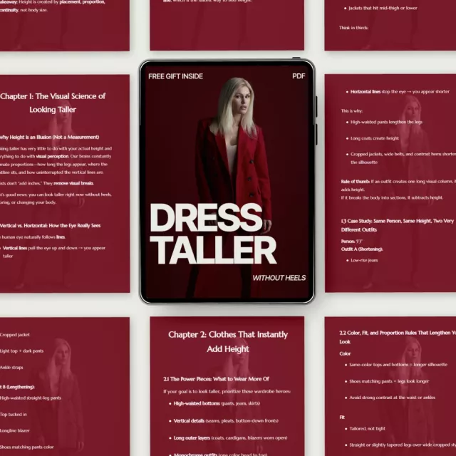 Height isn’t just about inches—it’s about perception. Dress Taller Without Heels is a practical, confidence-boosting digital guide that shows you exactly how to create the illusion of height using clothes you already own (and smarter choices when you shop). If you’ve ever stood in front of your closet wondering what clothes make me look taller, this guide gives you clear answers backed by visual science, real outfit examples, and easy-to-follow rules.
