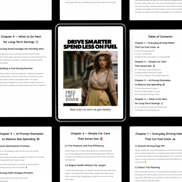 Drive Smarter, Spend Less on Fuel – Digital Guide, eBook & Checklist for Fuel Savings, Car Care Tips, AI Driving Prompts, and Everyday Gas Budget Hacks