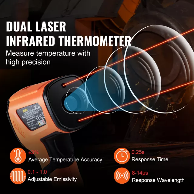 Take your temperature measuring to the next level with this high-performance dual laser infrared thermometer gun. Designed for accuracy, speed, and safety, it delivers precise readings from a safe distance, making it a must-have for professionals and enthusiasts working with extreme heat. With an adjustable emissivity range from 0.10 to 1.00, a rapid 0.25-second response time, and a wide temperature range from -40°F to 2732°F, this tool is built for the toughest jobs. Whether you’re working in metal smelting, automotive repair, industrial maintenance, or high-heat cooking, you can count on this thermometer for consistent, reliable results.