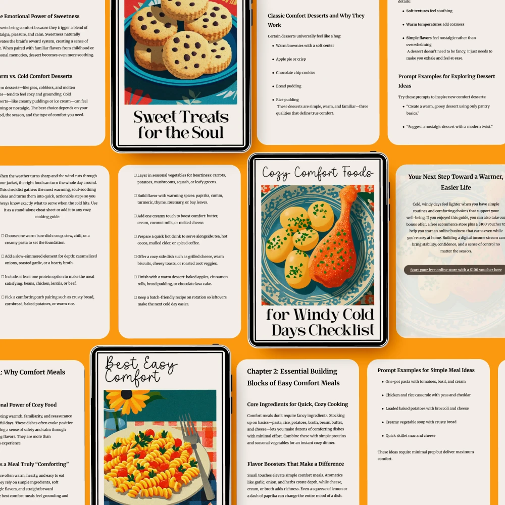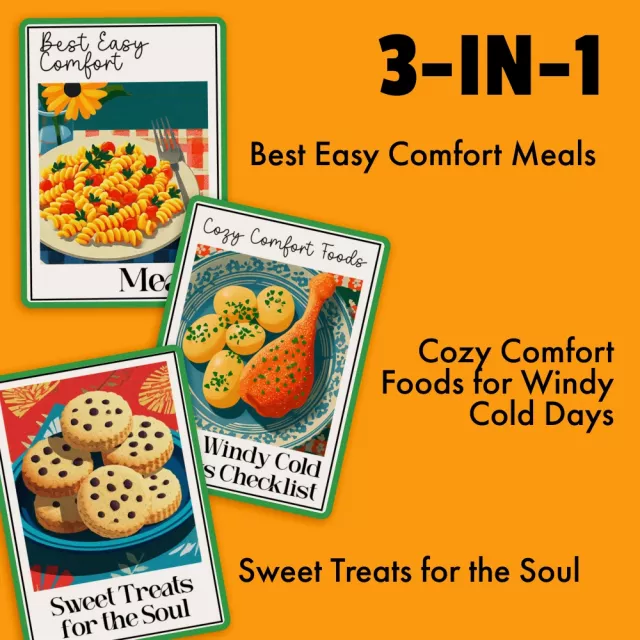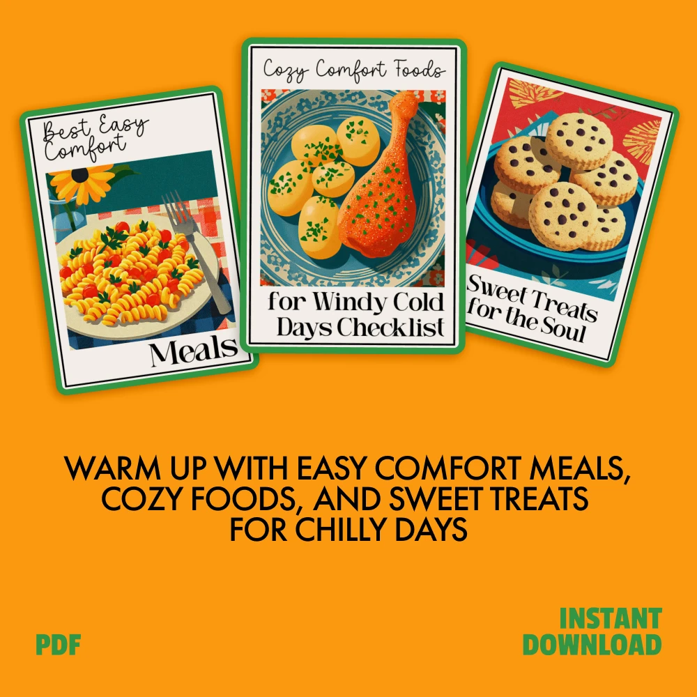This bundle is more than just recipes; it’s a bundle of warmth, convenience, and joy. Whether you’re looking to create the best easy comfort meals or indulge in something sweet, you’ll find exactly what you need to turn your home into a cozy haven. Our Cozy Comfort Foods for Windy Cold Days Checklist is the ultimate guide to keeping the chill at bay with comfort foods that are both hearty and satisfying. Plus, with our collection of Sweet Treats for the Soul, you’ll have just the right snacks to enjoy while binge-watching your favorite shows or reading a good book.