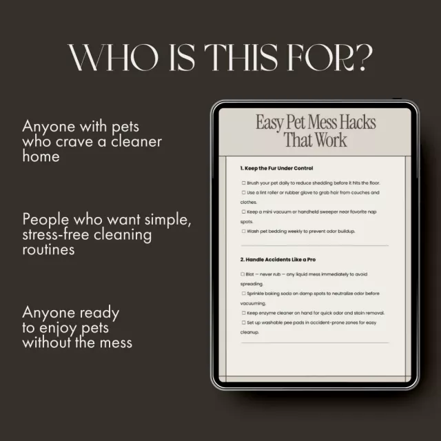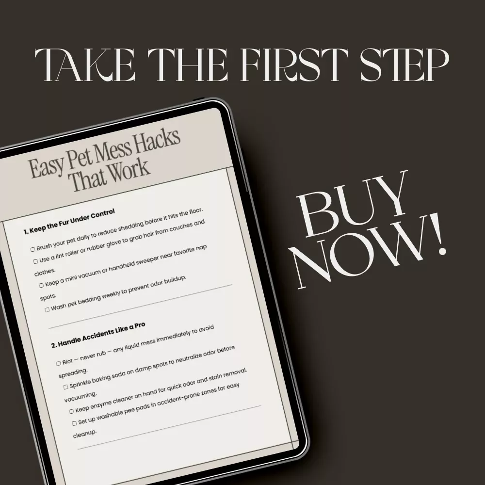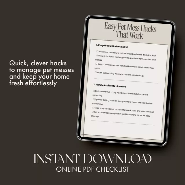 Love your furry friend but not the mess? Easy Pet Mess Hacks That Work is your go-to digital checklist for staying ahead of pet fur, odors, and spills—without losing your sanity. Designed for busy pet parents, this easy-to-follow guide gives you simple hacks to help with pet mess so your home stays clean, fresh, and organized every day. Whether you have a dog, cat, or both, these quick, practical tips make cleaning up after your pets stress-free and efficient.