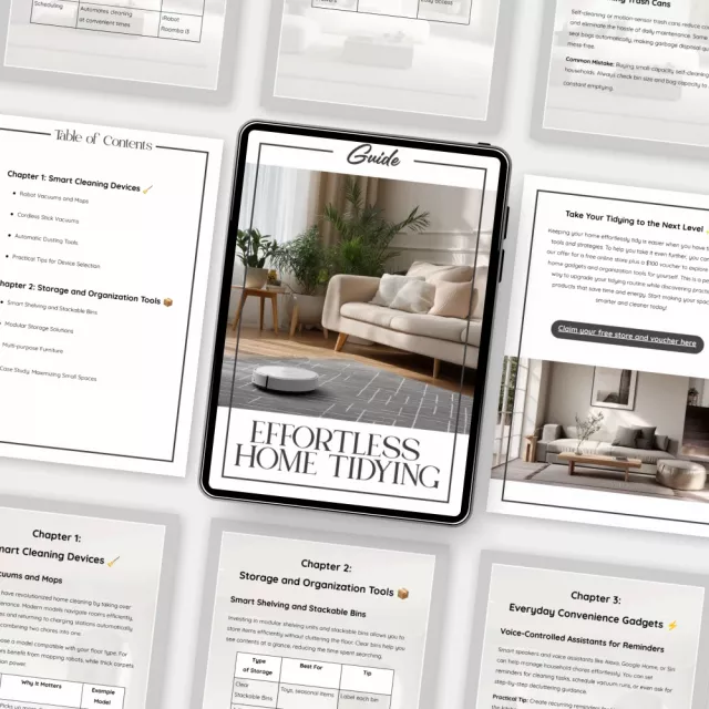 Unlike other eBooks that simply list cleaning products, the Effortless Home Tidying guide helps you create a connected, intelligent system for home care. You’ll not only learn about the best home devices for effortless tidying, but also how to integrate them seamlessly into your lifestyle — supported by AI-driven insights and modern design principles.