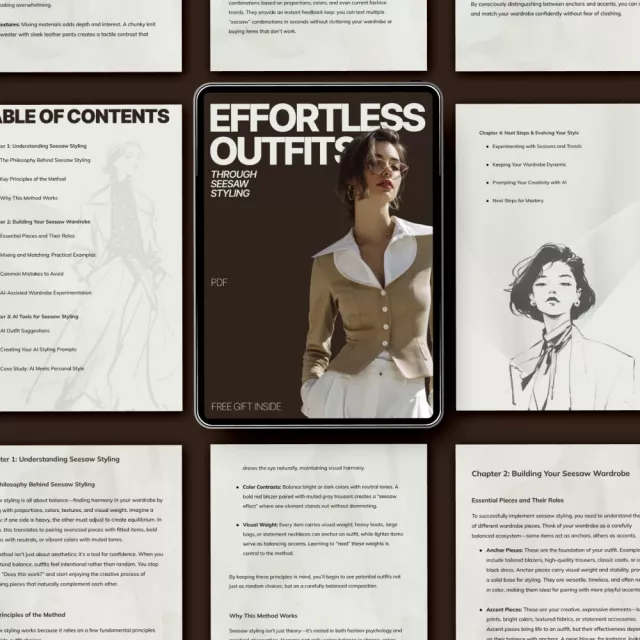 Creating outfits that feel balanced, stylish, and effortless does not have to be overwhelming. Effortless Outfits Through Seesaw Styling is a thoughtfully designed digital guide that introduces you to a smarter way of getting dressed using the proven seesaw styling method. This guide walks you step by step through building outfits that feel intentional, modern, and true to your personal style, while also showing you how to use AI tools to experiment and evolve with confidence.