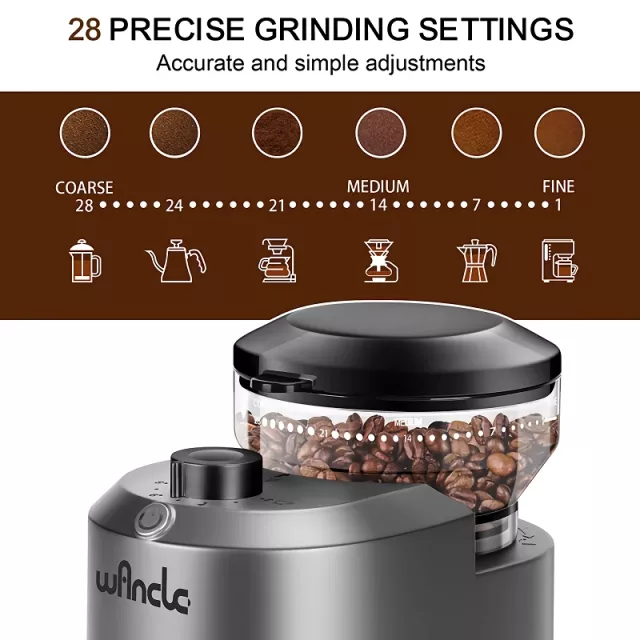 Upgrade your coffee routine with this electric burr coffee grinder, designed to bring out the freshest, most flavorful cup every time. Featuring 28 precise grind settings, it allows you to adjust the grind size from fine to coarse, perfect for espresso, drip coffee, French press, cold brew, and more. Whether you prefer a rich, bold espresso or a smooth French press, this grinder tailors each grind to your taste, unlocking the full aroma and depth of your coffee beans.