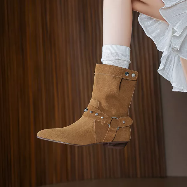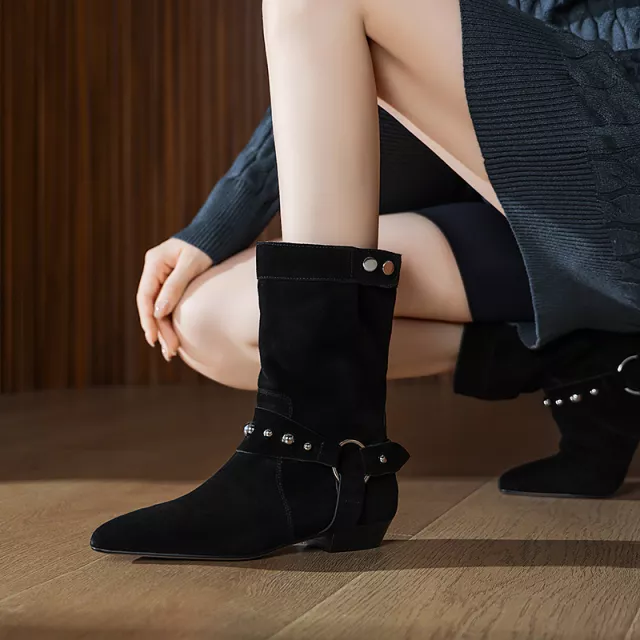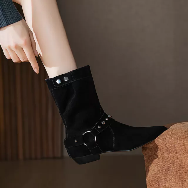 Upgrade your wardrobe with these stunning cow suede ankle boots, designed for women who love a blend of comfort and chic fashion. With a sleek pointed toe and a stylish low square heel, these boots are perfect for everyday wear or special outings. The buckle strap adds a touch of elegance, making them a must-have for any fashion-forward woman this season.