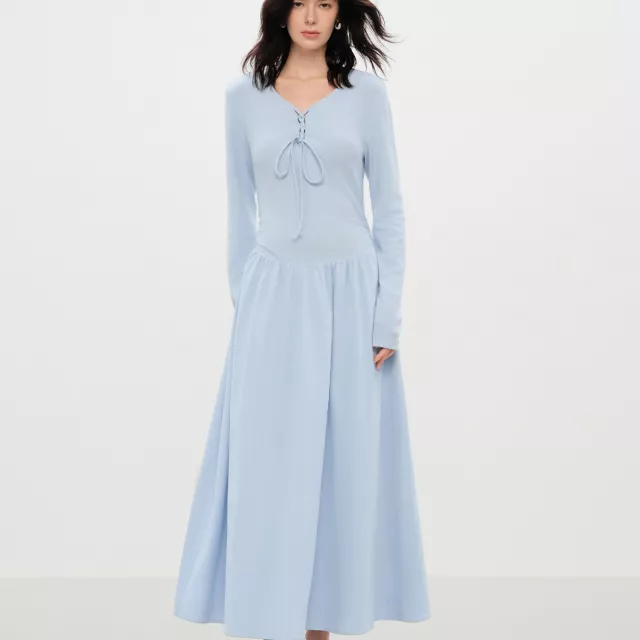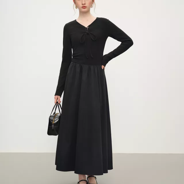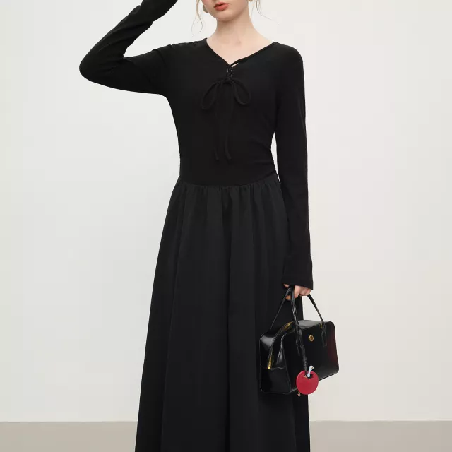 Featuring a refined V-neckline and a charming bow detail, this long-sleeved dress brings effortless femininity to your wardrobe. The full-length sleeves provide warmth during cooler months, making it perfect for outdoor events, holiday dinners, cozy evenings out, or stylish office days. Its pullover design ensures easy wear, while the stretchy knit construction offers a comfortable, flexible fit all day long. Whether paired with heels for a dressy look or boots for a chic casual vibe, this dress adapts to your style with ease.