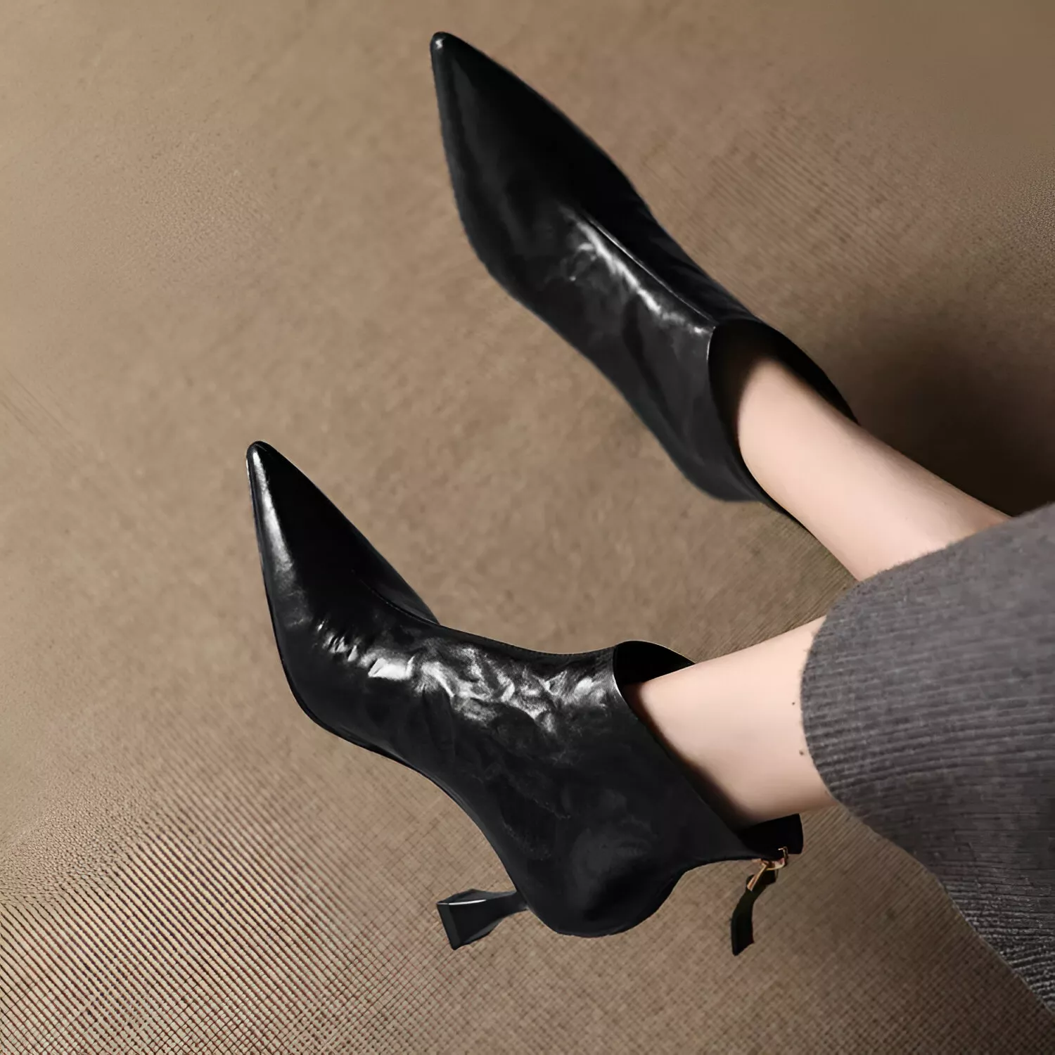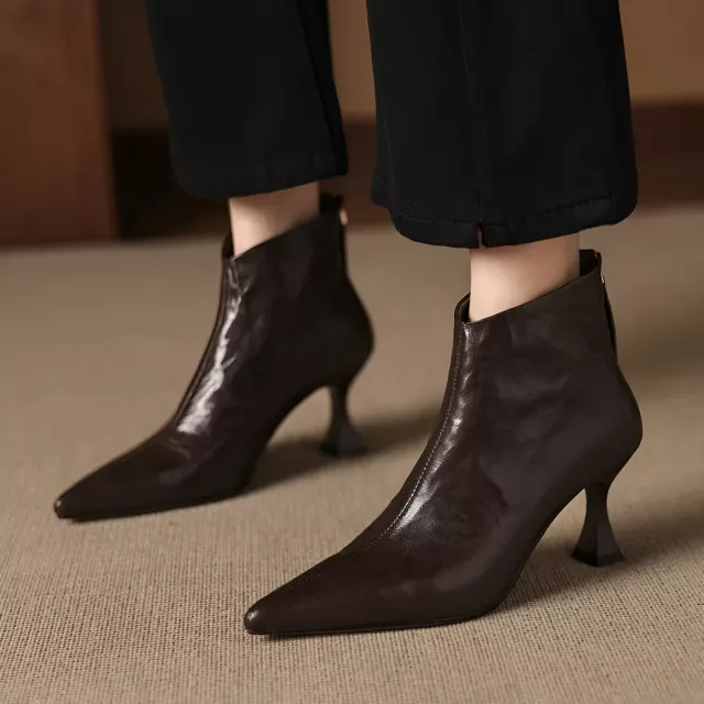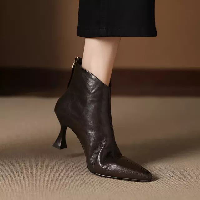 These ankle boots stand out for their balance of style and practicality. The pointed toe creates a slimming effect on your legs, while the minimalist design makes them easy to pair with jeans, skirts, dresses, or tailored trousers. A side zipper ensures quick and easy wear, so you’ll never struggle when getting ready.