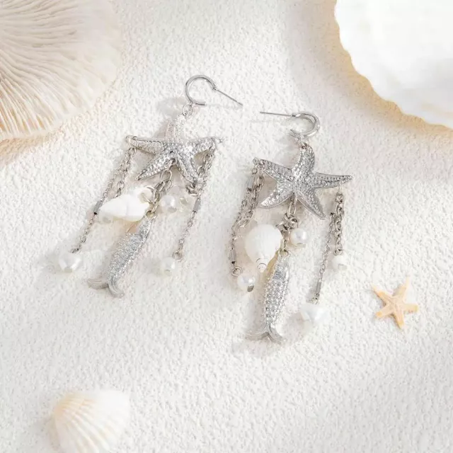 Elegant Starfish Conch Tassel Drop Earrings Imitation Pearl