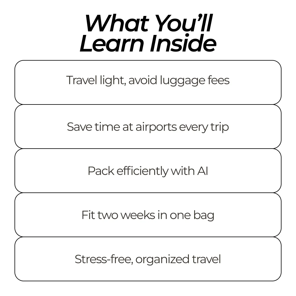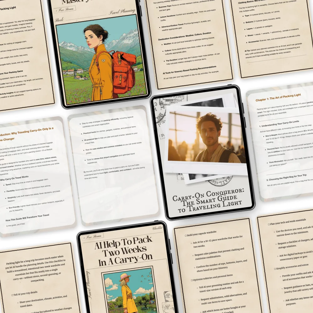 • Carry-On Conqueror: The Smart Guide to Traveling Light – Step-by-step guidance on selecting, organizing, and maximizing your carry-on essentials.