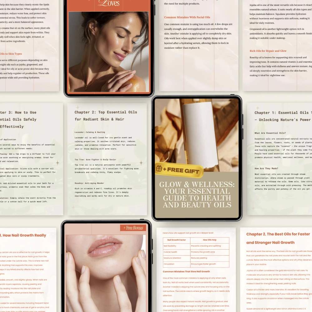 • Glow & Wellness: Your Essential Guide to Health and Beauty Oils – A comprehensive eBook connecting beauty routines with overall well-being.