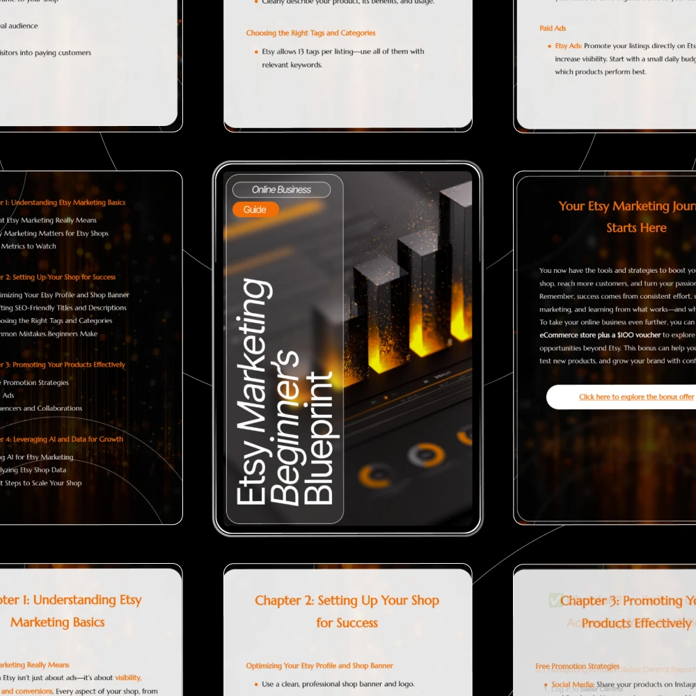 • Chapter 3: Promoting Your Products Effectively – Master free and paid promotion methods, including Etsy ads, influencer outreach, and collaboration ideas.