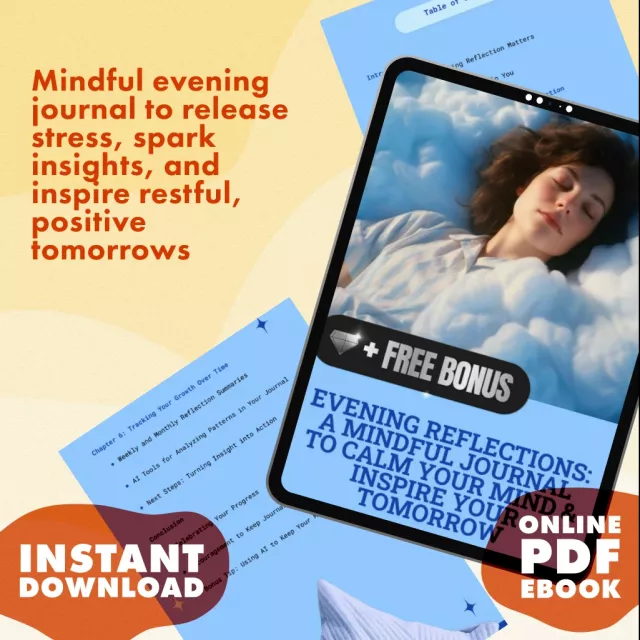 End your day with intention and peace. Evening Reflections: A Mindful Journal to Calm Your Mind & Inspire Your Tomorrow is a beautifully designed digital eBook that guides you through the art of nightly reflection. This mindful evening reflection journal helps you quiet your thoughts, capture the day’s lessons, and prepare your mind for restful sleep and a brighter tomorrow. More than just a journal, it combines practical guidance with modern AI-inspired tools to make your evening routine both calming and deeply insightful.