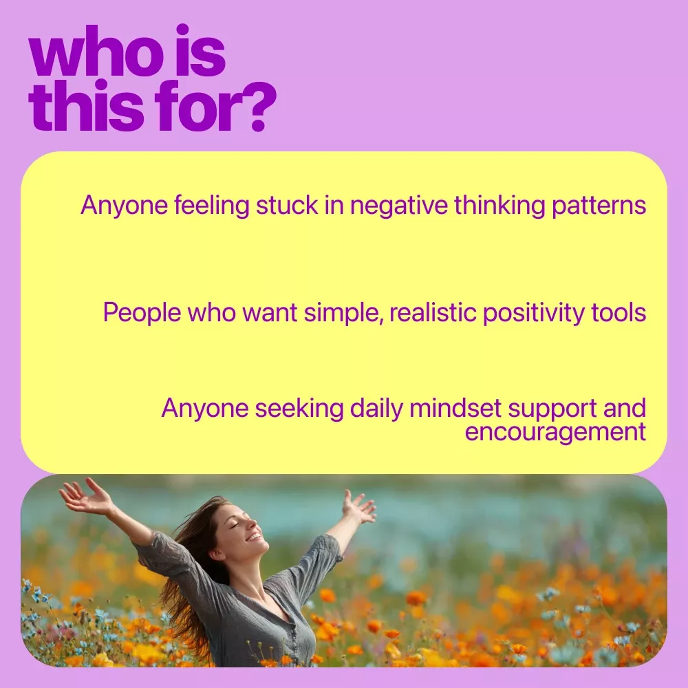 This toolkit is for anyone feeling stuck in negative thinking, emotional burnout, or self-doubt. It’s ideal for beginners to mindset work, journaling lovers, self-care seekers, or anyone looking for gentle daily encouragement.