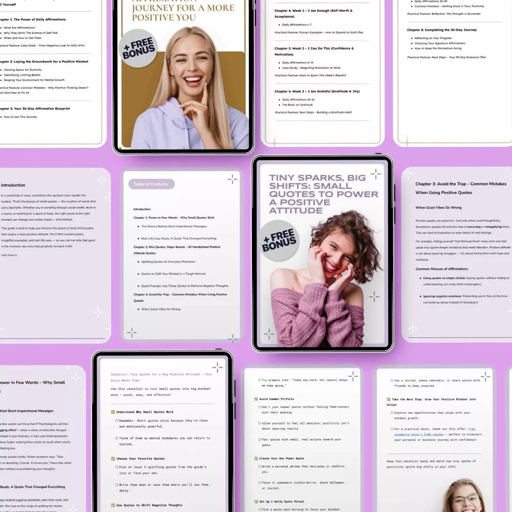 What a wonderful bundle! I've been feeling stuck in negative thinking and this toolkit really helped me shift my mindset. The Tiny Sparks, Big Shifts quotes are bite-sized but pack a punch when it comes to daily motivation. They're easy to digest and have become an essential part of my morning routine.