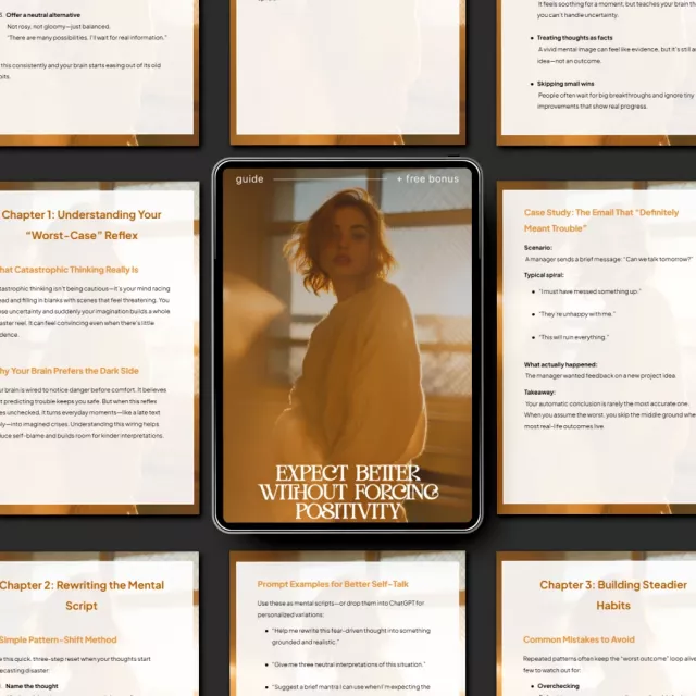 Unlike generic positivity workbooks, Expect Better Without Forcing Positivity focuses on realistic emotional processing. It doesn’t tell you to ignore fear — it teaches you how to work with it using practical reframing, habit building, and logic-based tools like Rewriting the Mental Script and A Simple Pattern-Shift Method. You’ll also learn modern strategies like How to Use AI to Strengthen Healthier Thinking, setting this resource apart from outdated self-help PDFs.
