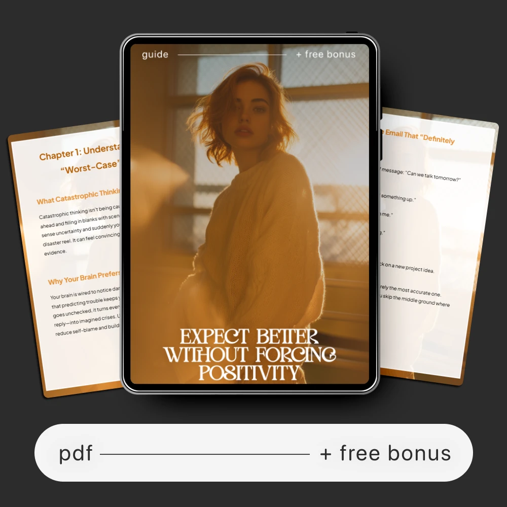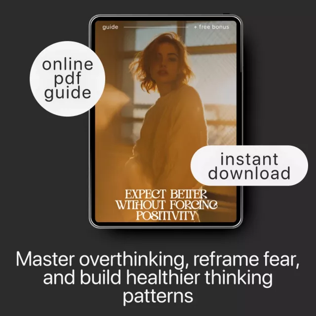 If you’re tired of being told to “just think positive” when your brain is in full panic mode, this guide is for you. Expect Better Without Forcing Positivity is a practical, science-backed digital download that teaches you how to challenge overthinking and catastrophic thinking without invalidating your feelings. It meets you where you are — anxious, overanalyzing, uncertain — and shows you how to build steadier, calmer thought patterns in a way that actually sticks. No toxic positivity. No vague motivation. Just clear tools for real life.