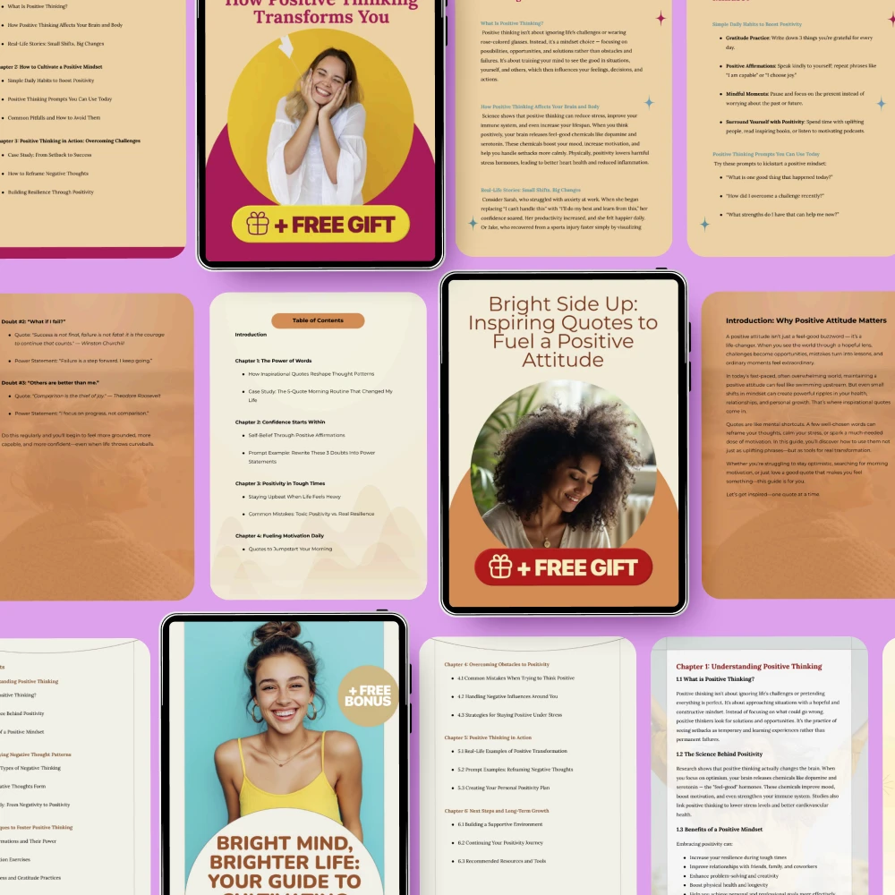Ready to transform your life with the power of positive thinking? Introducing the Exploring the Power of Positive Attitude 5-in-1 digital bundle, designed to help you cultivate a brighter, more optimistic outlook on life. Whether you’re looking to enhance your personal growth, inspire others, or simply embrace a more positive mindset, this collection of eBooks, guides, and checklists offers everything you need to start thinking and living brighter today. With practical tips, inspiring quotes, and step-by-step advice, this bundle is your guide to harnessing the incredible benefits of positivity.