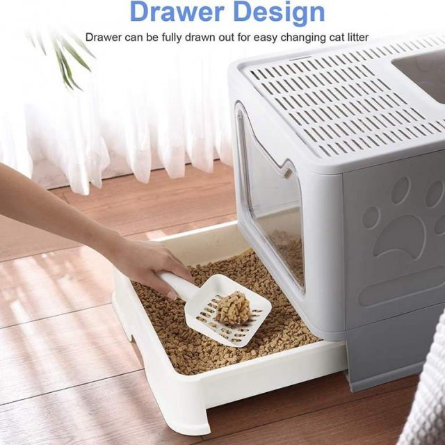Extra Large Foldable Top Entry Cat Litter Box with Hood, Drawer, and Scoop