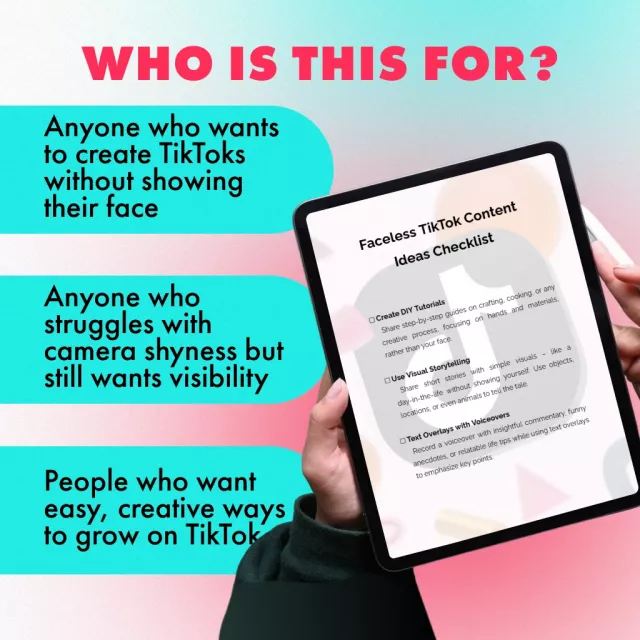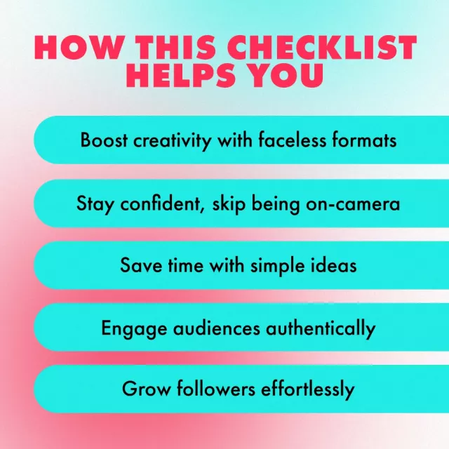 Stop struggling with content block and start posting with confidence. Download the Faceless TikTok Content Ideas Checklist today and unlock endless inspiration for your TikTok journey!