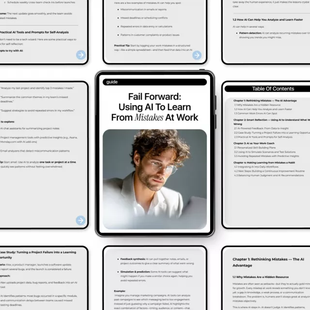 Unlike generic productivity guides, Fail Forward: Using AI to Learn from Mistakes at Work focuses on real-world reflection, practical AI prompts, and habit-building strategies you can apply immediately. It blends human insight with AI support, helping you learn better—not just faster.