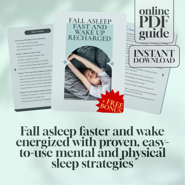 Struggling with tossing, turning, and racing thoughts at bedtime? Fall Asleep Fast and Wake Up Recharged is the ultimate digital guide that shows you exactly how to go to sleep quickly, naturally, and consistently. Whether your mind won’t stop spinning or your body just can’t seem to settle, this guide offers a clear, science-backed path to better sleep—without relying on medication or gimmicks. If you’re ready to fall asleep faster and wake up truly refreshed, this is the toolkit you’ve been looking for.